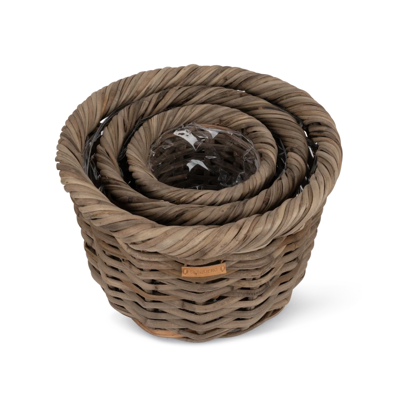 Kurvesæt af Kraftigt Rattan – Sæt á 3 Dette elegante sæt af tre kurve, håndflettet i kraftigt rattan og foret med plast, kombinerer det naturlige og praktiske i ét design. Ideelle til udstillinger i butikken, hvor de kan bruges som smukke plantekurve eller som en pæn opbevaringsløsning. Med en tidløs og rustik charme er disse kurve et perfekt valg til ethvert butiksmiljø, der ønsker at have produkter af organisk udseende og god kvalitet. Mål: Small: Diameter: 23 cm (bund), 28 cm (top), Højde: 18 cm. Medium: Diameter: 35 cm (bund), 39 cm (top), Højde: 25 cm. Large: Diameter: 50 cm (bund), 55 cm (top), Højde: 30 cm.