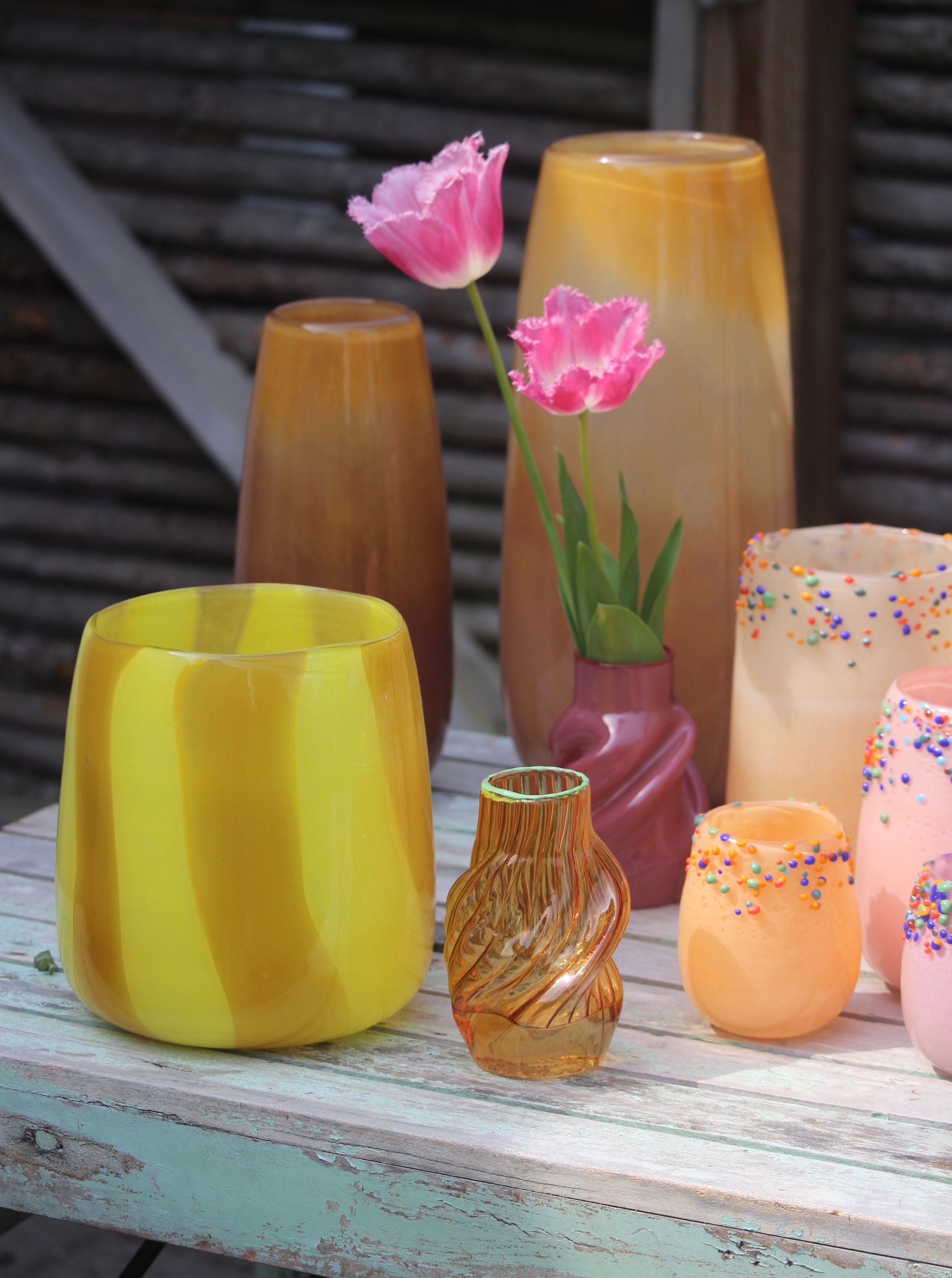 Vasens buttede form giver et stabilt udtryk, og gør vasen smuk både med og uden blomster. En iøjnefaldende glasvase, der tilfører lys og varme til rummet.
