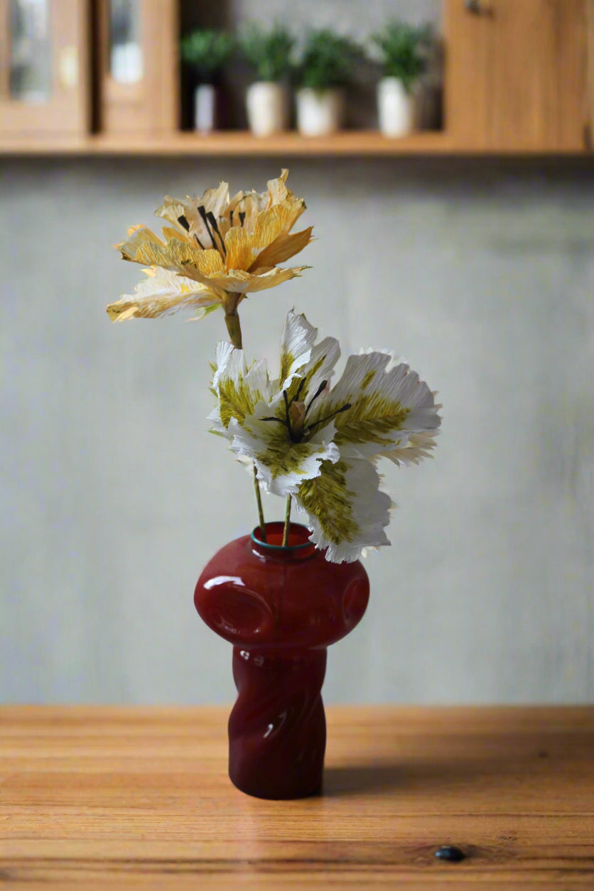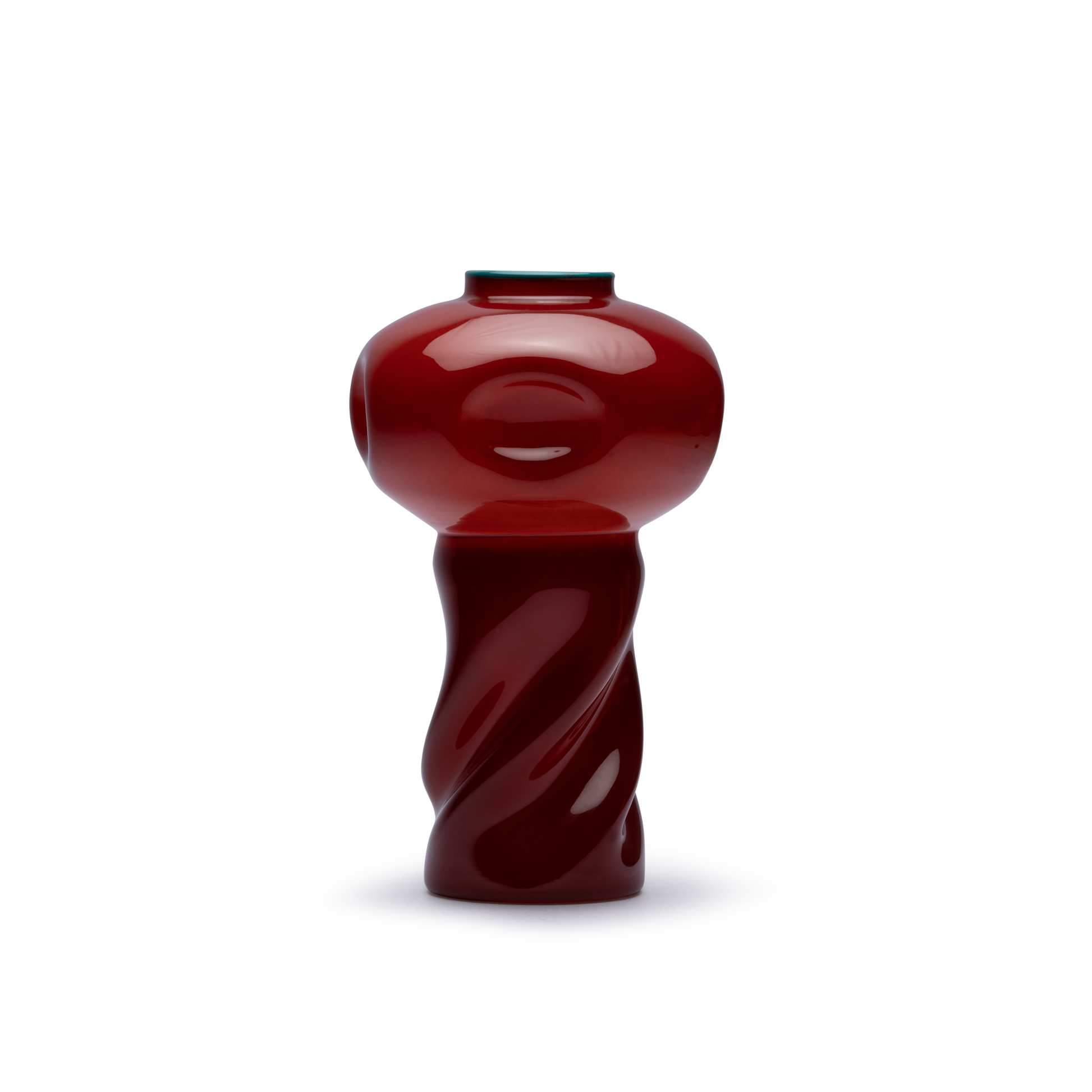 En vase med kunstnerisk form og dyb rød farve, der skaber blikfang i ethvert rum.